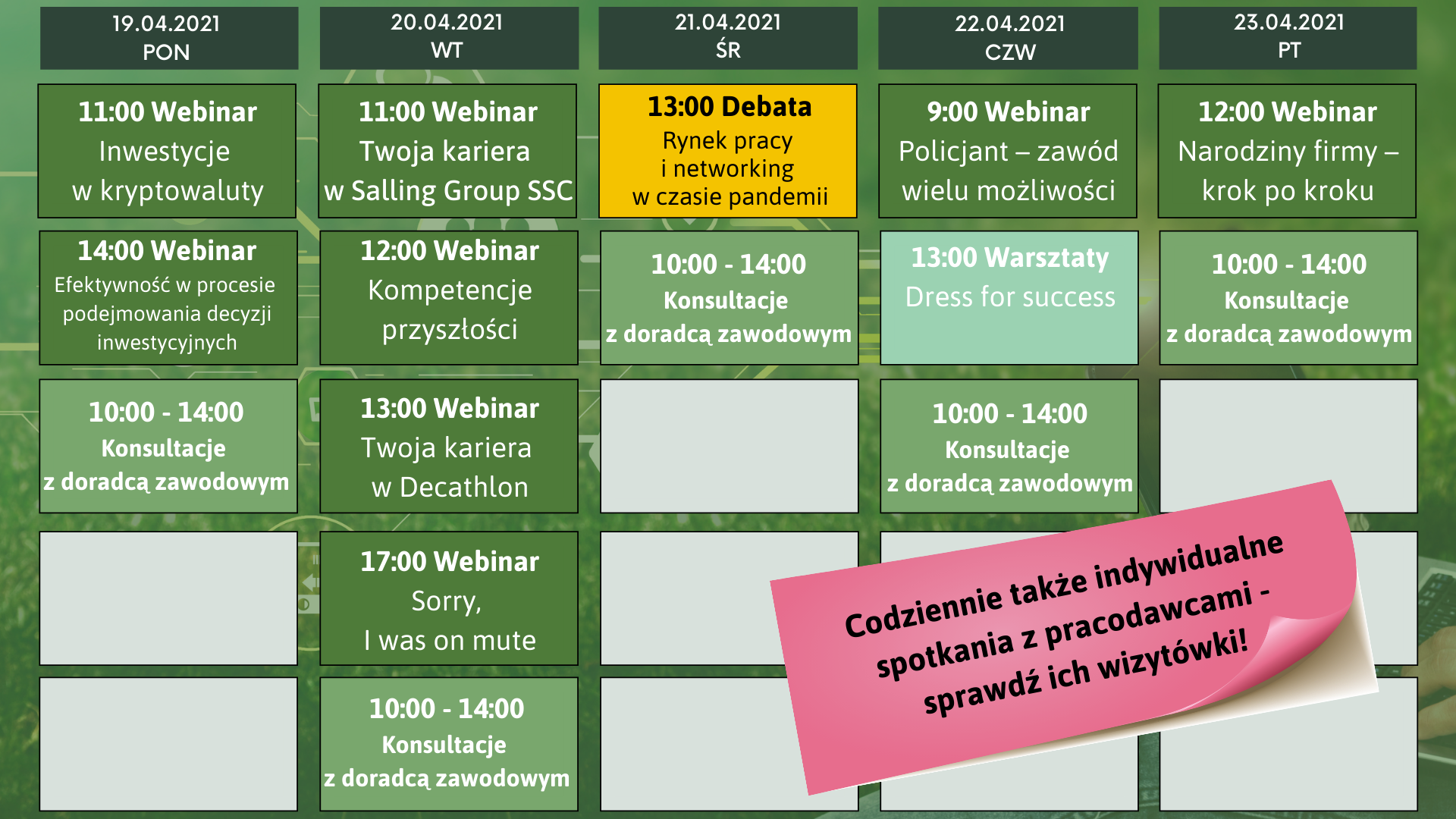 Poniżej przedstawiamy rozkład jazdy obowiązujący podczas Wirtualnej Giełdy Pracy – Networking Week: